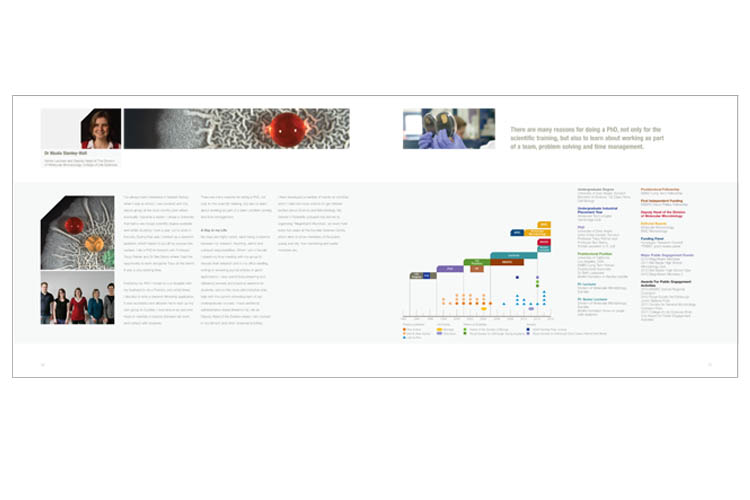 The College of Life Sciences at the University of Dundee commissioned Arc Visual Communications to develop a visual language for a publication and website that would promote the various career pathways of scientists working within the College of Life Sciences.
